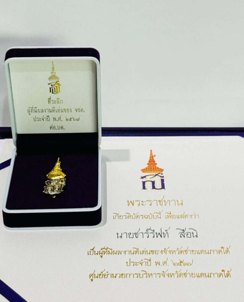 วันพฤหัสบดีที่ 18 กันยายน 2568 เวลา 13.00 น. ดร.ชาร์รีฟท์ สือนิ ศึกษาธิการจังหวัดนราธิวาส เข้ารับพระราชทานเกียรติบัตรและเข็มรางวัลแก่ผู้มีผลการปฏิบัติงานดีเด่นในพื้นที่จังหวัดชายแดนภาคใต้ ประจำปี 2567 จากสมเด็จพระกนิษฐาธิราชเจ้า กรมสมเด็จพระเทพรัตนราชสุดาฯ สยามบรมราชกุมารี ในโอกาสทรงปฏิบัติพระราชกรณียกิจในจังหวัดยะลา ณ อาคารศูนย์อำนวยการบริหารจังหวัดชายแดนภาคใต้ (ศอ.บต.) ตำบลสะเตง อำเภอเมืองยะลา จังหวัดยะลา